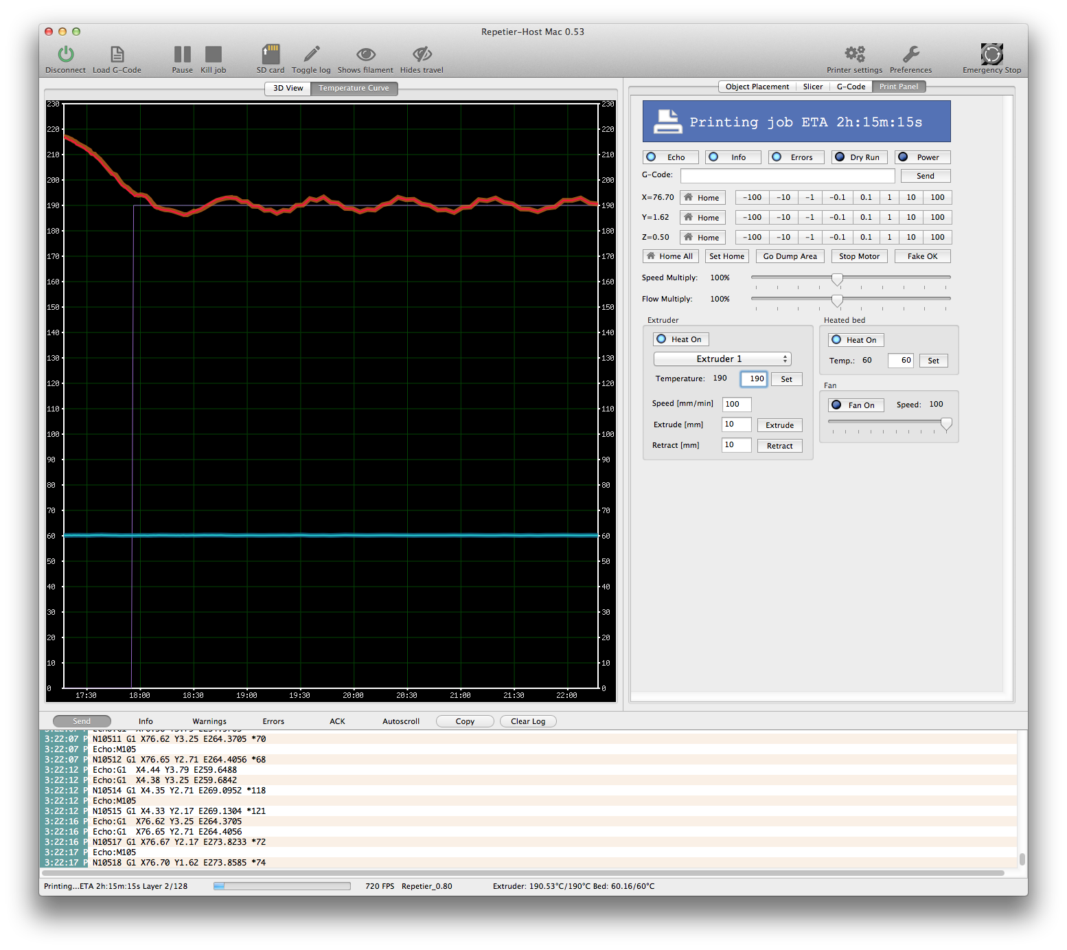 I shut off the heat because I thought I was on my way to a meltdown. I checked the wiring while it continued to print during the cool down and all seemed ok. So I set the temp to 190°C and turned the heater on and now seeing this: