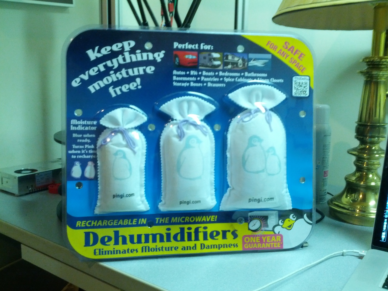 Back to dehumidifiers... I've been storing my spools, including the nylon, in jumbo hefty bags with desicant and they seem to be reasonably dry. I picked these up at BJ's Wholesale Club. I wonder how well they will work? I like the fact that they have moisture indicators and you can recharge them in the microwave.
