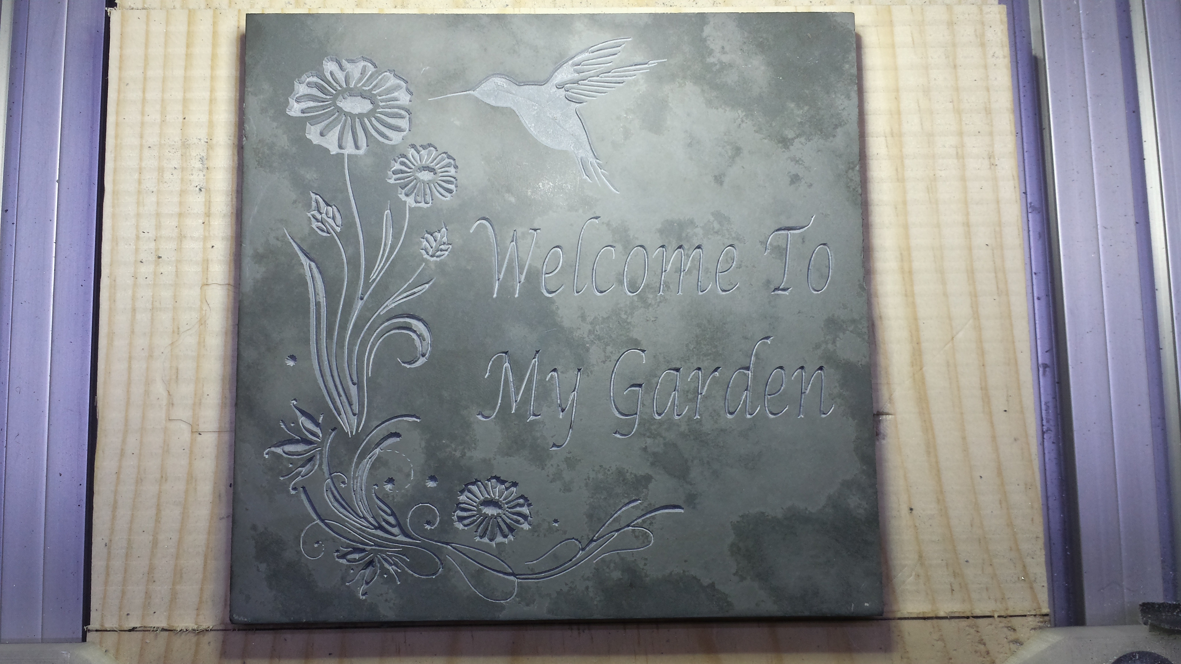 This is Spanish green slate milled with the same 30 degree .2mm tip bit. Garden sign for my sister's humming bird garden.