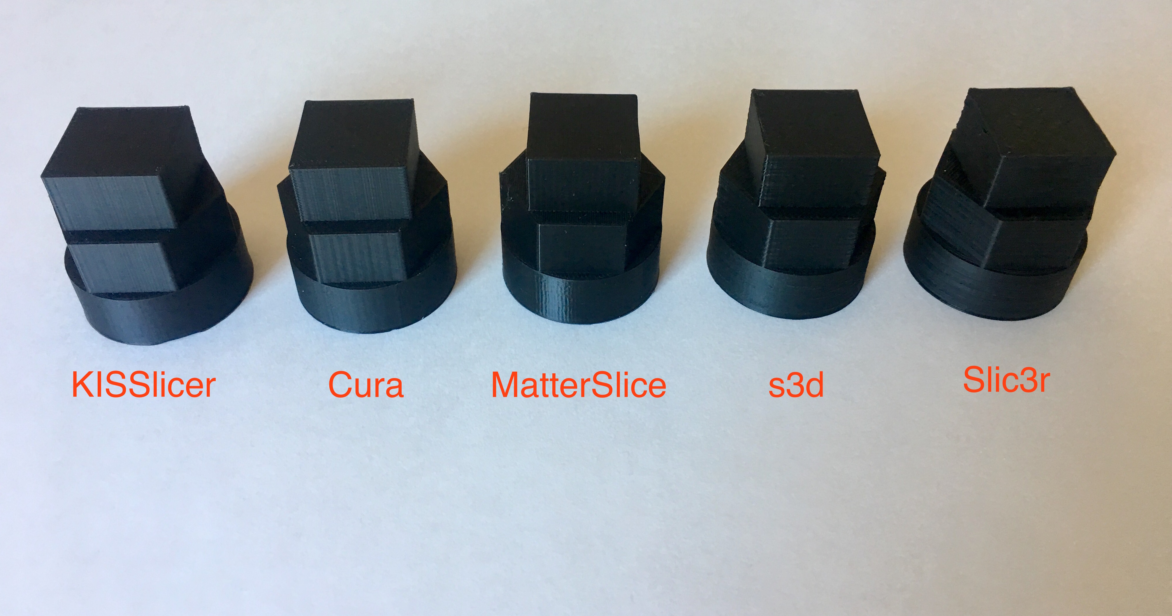 KISSlicer: although maybe not as obvious in the photo, the parts were much cleaner, more consistent and had better surface finish on both the perimeters and top and bottom surfaces.