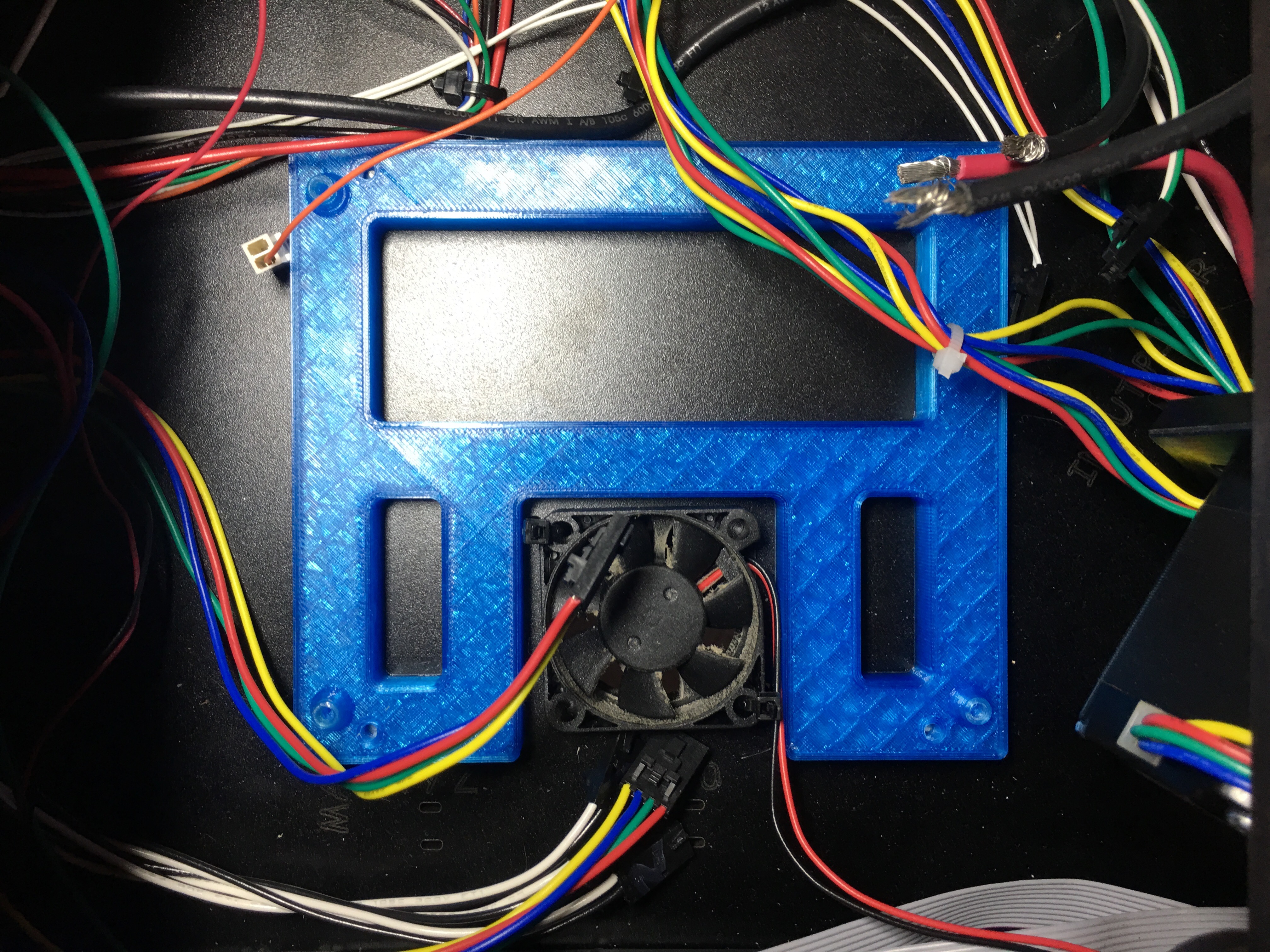 Here's a mount that makes it easy to install a Duet (any version) to replace the stock RAMBo. It has a cutout for the V3's cooling fan. It is attached using the 4 screws that were used to attach the white pillars. Install this first and then attach the Duet with it's power connectors to the right (as you face the front of the machine).