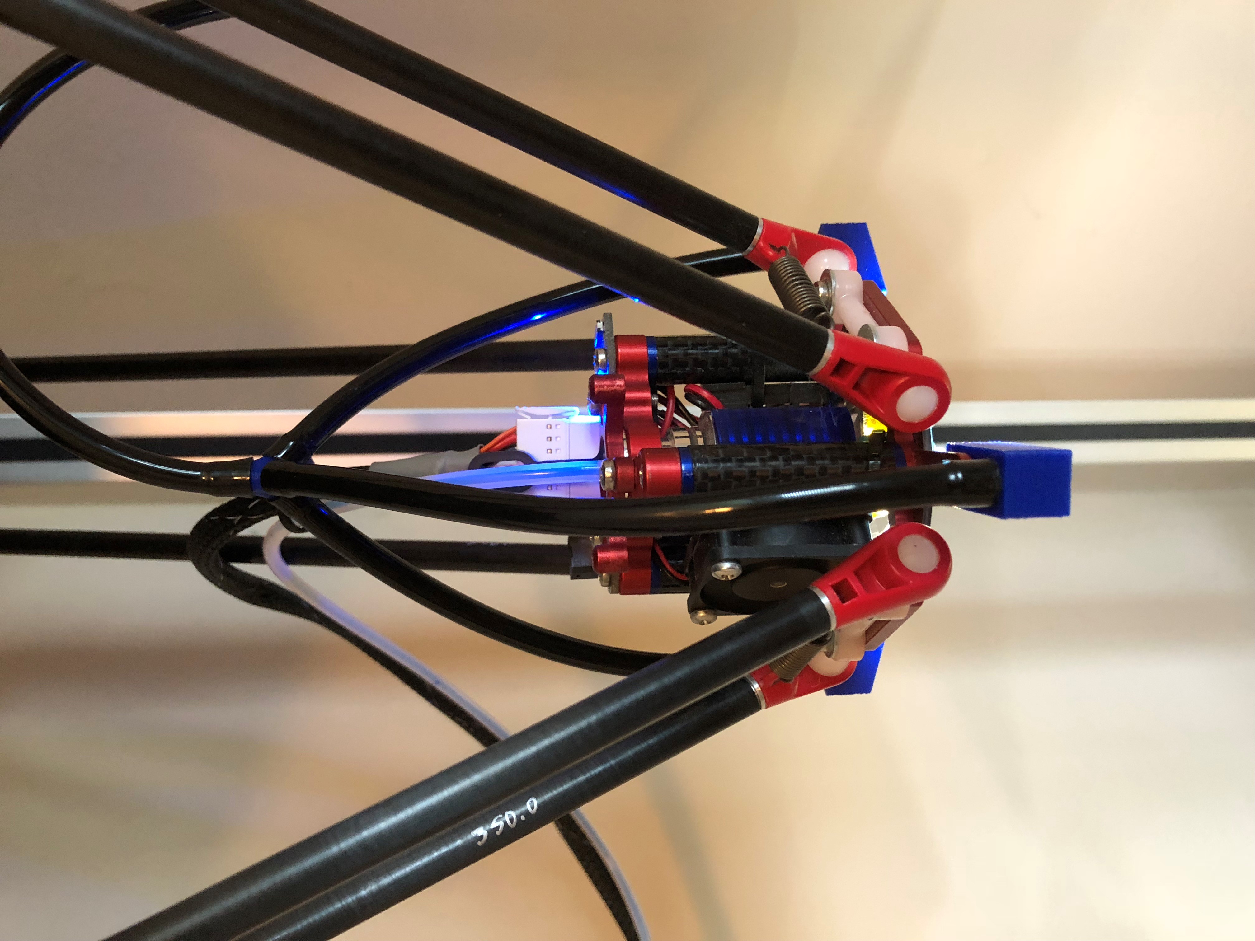 Between switching to FSR and so being able to lose the accelerator PCB above and losing the three stock layer fans below, my effector assembly is beautifully uncluttered now. I am using the 713Maker mount for the E3D v6 hotend along with the bowden adapter lock ring so I could extend the otherwise recessed PCT connector. Its light and open for easier viewing of the print.