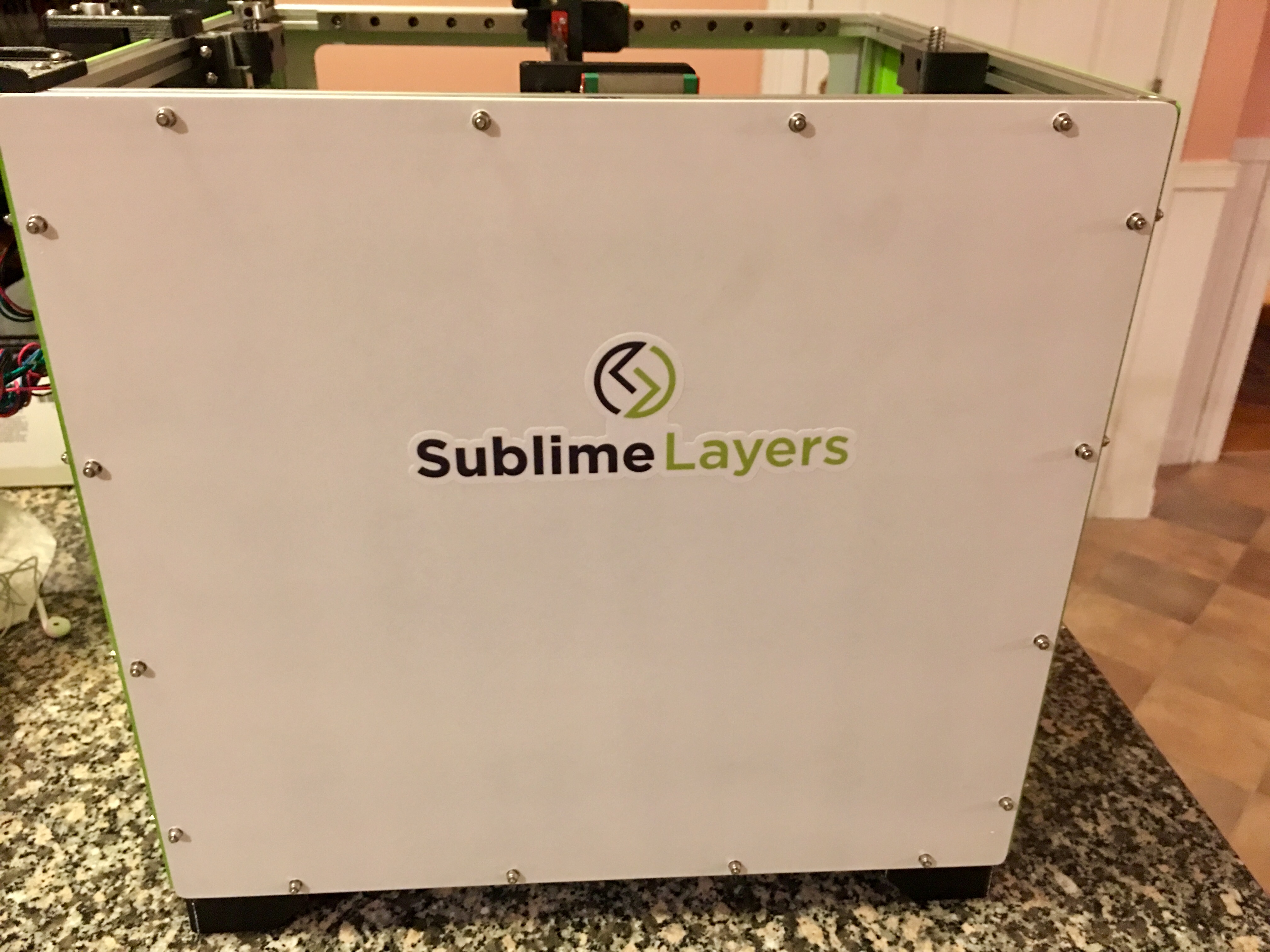 I hosted a couple of sessions in my kitchen for RailCore builds and as you see in the photo, a friend doing a Duet Wifi, Trick Laser arms, and Bondtech BMG upgrade to his RMax V2. I painted my aluminum with PlastiDip spray cans in Sublime Green (I kid you not), white and a black bottom. The results are really nice. And of course it gets my logo on the back. Here is the awesome base plate that Matt at 713Maker machines for the RailCore. Superb work: and my custom water cooled V6 hot end: Palette+ tubing mount The specs are: