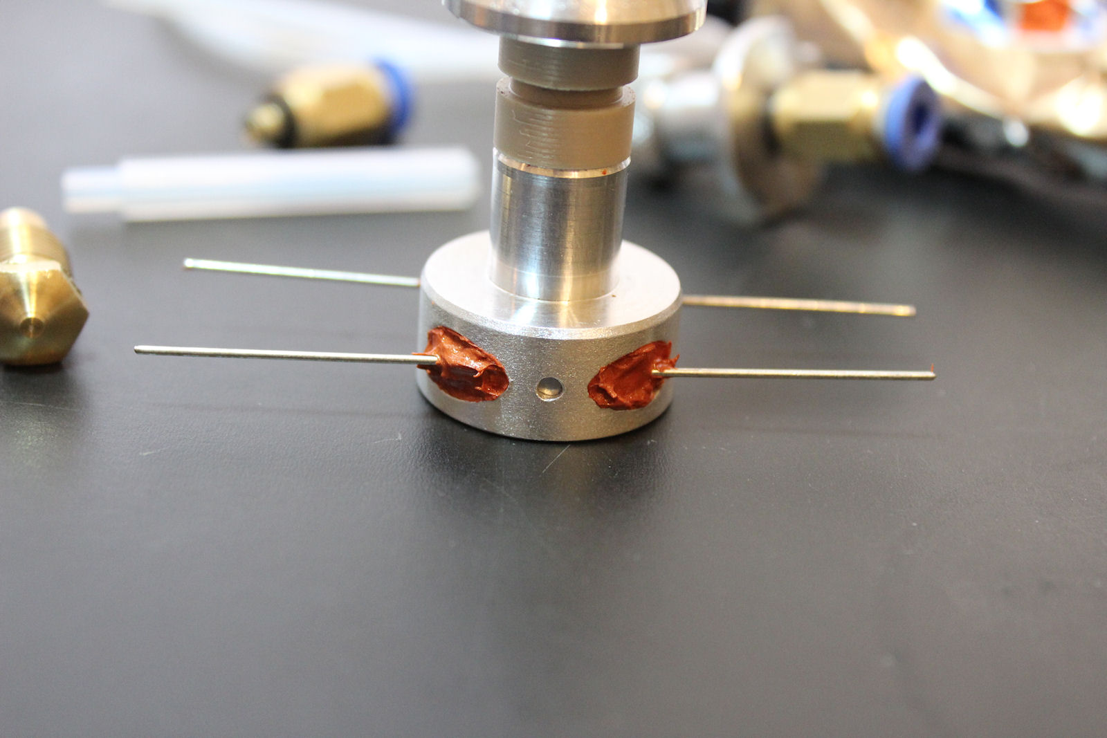 This hole is much deeper (>5mm) and will easily accommodate the thermistor with PTFE tubing on its leads. The depth of the hole is such that the thermistor will contact a surface about 1mm from the threads on the nozzle. This allows the thermistor to meter the temperature of the nozzle almost directly (a more reliable measure of the temperature of the nozzle). With a nice dab of RTV the thermistor will mount very securely. I'm inclined to mount the thermistor in this second location.