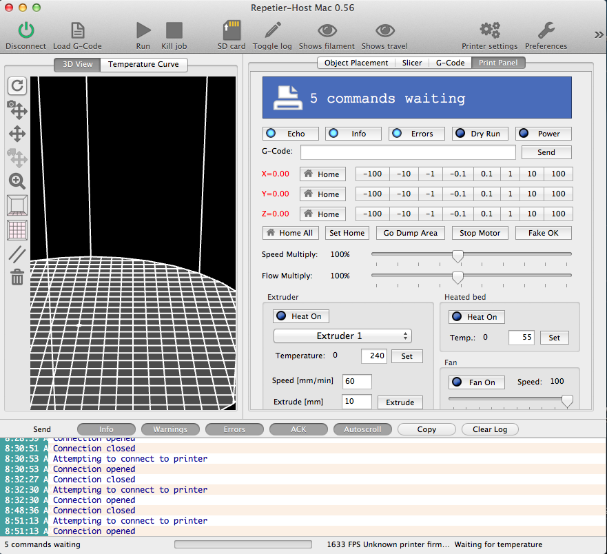On Mac 10.8.2, Arduino 1.04, Repetier 0.56 (53), using tty modem to connect. I have firmware already configured with the latest settings except for the baud rate. It was set to 56K.