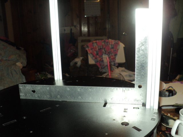 First of all at the base, i can take some off the shelf angles (used to re-enforce corners on shelves and such). Dust one side on an angle plate to ensure that they are perfectly square and place them on the base. (three would be used per extrusion)