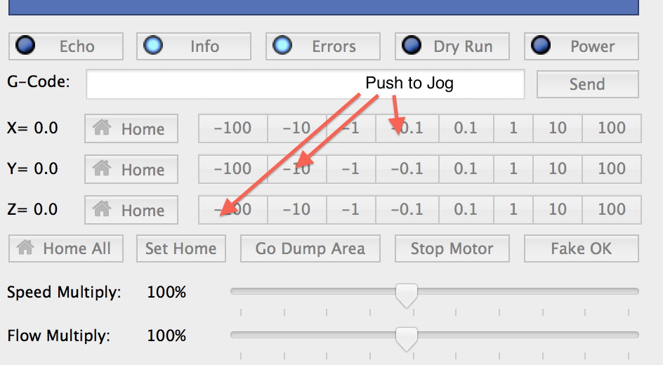 The Mac version does not have directional arrows- you push on the buttons on the print panel to jog in each axis As for my LCD it hasn't worked since I finished hooking everything up. It's showed the the blocks consistently. Even when I was controlling the printer with computer the LCD never worked