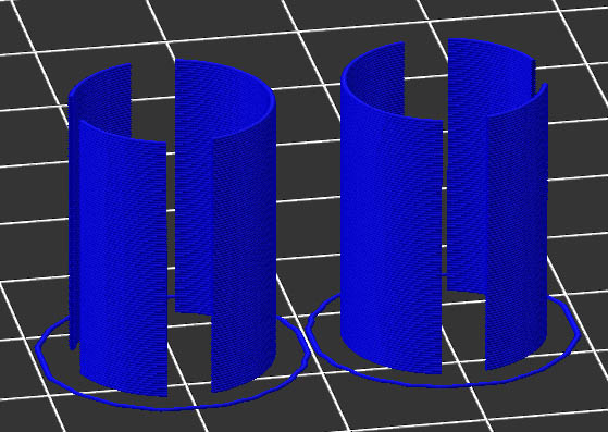 Working out some calibration issues on my Rostock Max and ran into a couple odd things in KISS. I created a simple test object consisting of two cylinders, each with a wall thickness of .55mm. When I slice it in KISS I end up with gaps in the final object. I've also had KISS tell me that it can't slice the object as the wall is thinner than the extruded width and it just quits. The picture below shows the preview in Repetier.