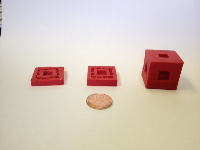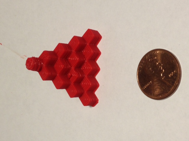 I have just entered into the world of 3D printing. I bought the Rostock Max kit from SeeMeCNC. It took me three weekend part time with the help of my two children Julia 6 and Thomas 5. I love technology but I have no formal training unless you think a business degree helps you in electronics. Everyone in my family thinks I am nuts except for my children that think the machine is going to be Santa Clause and build them any toy they can think up. I have printed the calibration cube and the 5mm calibration cube steps using SeeMeCNC 1.75mm ABS in red. Now I get to figure out why the bridges sag, there are gaps in the tops and why one side isn't flat.