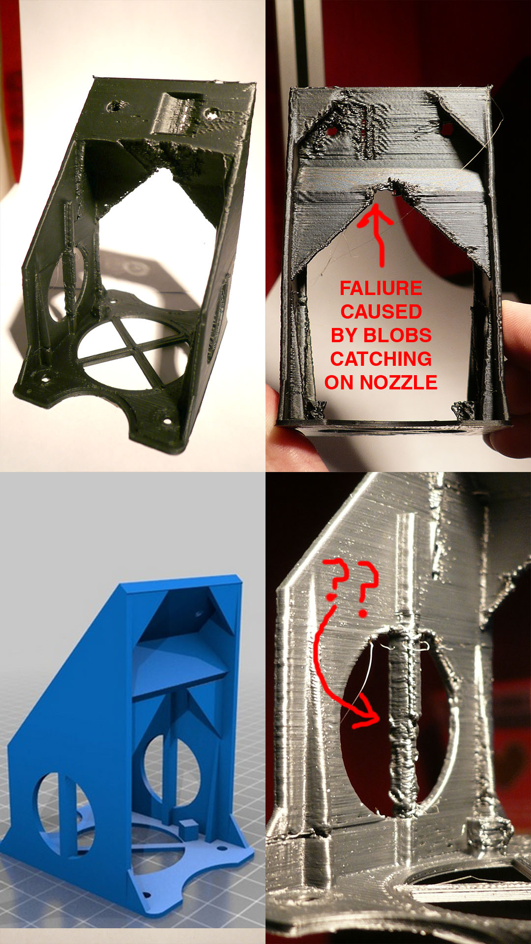 I'm guessing you are using Slic3r 1.0.0RC2? I have printed 4 of these things successful - all using KISSlicer. I've *attemted* to print 4 more using Slic3r 1.0.0RC2. I see artifacts like the "??" you show on almost very thin cross section "pillar" (like my fly fishing reel for instance). I have not tried an earlier version of Slic3r on this but I have been underwhelmed with Slic3r and the odd artifacts it leaves. In addition to those, I see consistent gaps in concentric top/bottom layers, odd infills, etc.