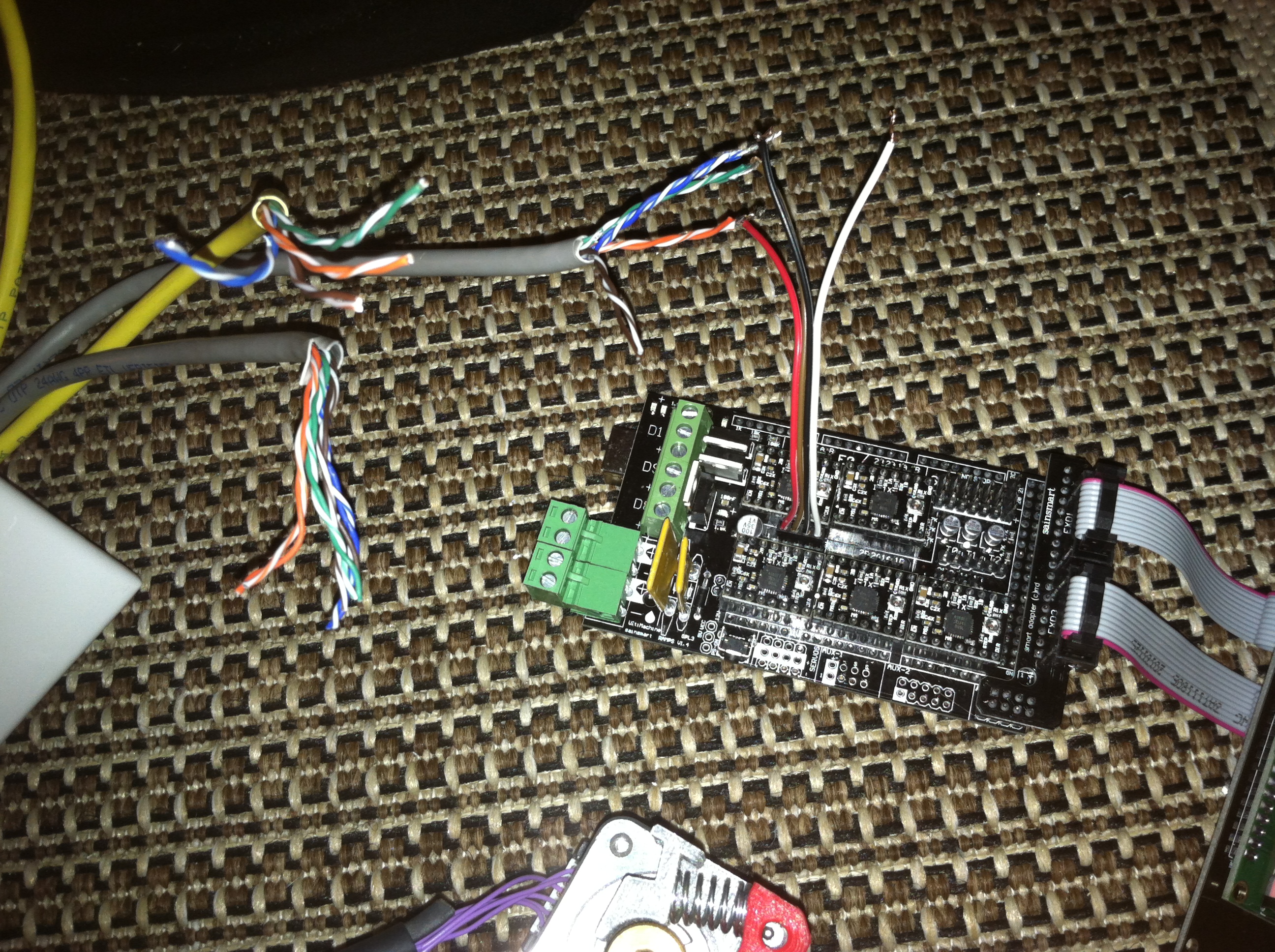 If you are using CAT5 as connections to your steppers, be careful as it is 24 gauge rated at .58A per conductor and the steppers draw a fair amount of current over that. I've seen folks double up the wires to the steppers since CAT5 has 8 conductors. That should work, perhaps you knew that already