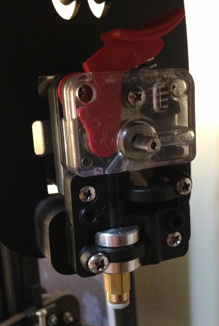 Step 12: replce the clear cover of the EZ struder, and feed in some filament, you will notice its slightly more difficult to get it in the ptfe liner, this is because of tighter tolerances, and if you have a gear or knob for the extruder, it makes life a LOT easier as you only need it to bite and you can use the knob to feed the filament.. heres me testing the feed..