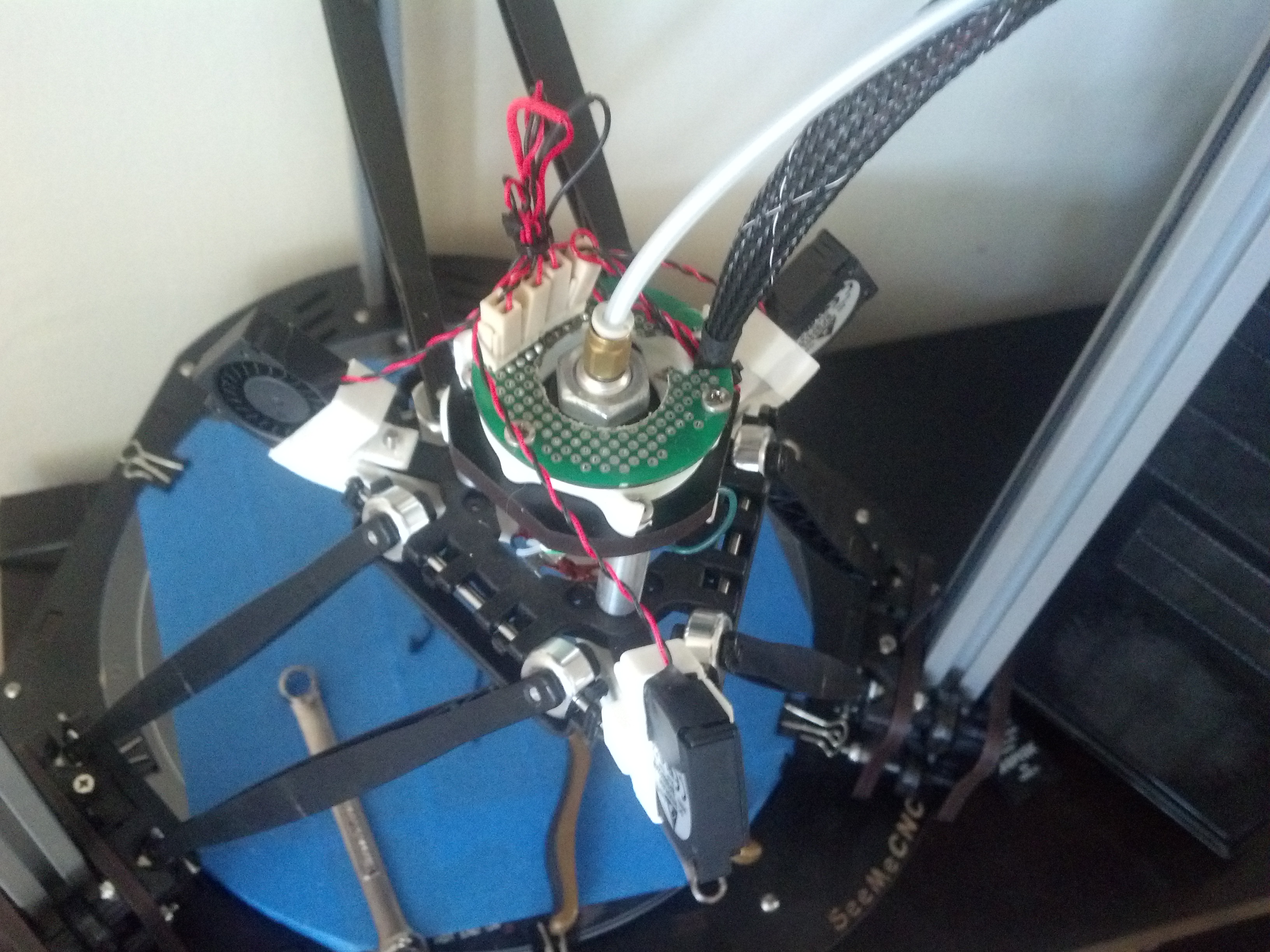 I aimed to do this upgrade with as little disassembly and as few custom designed parts as possible. I ordered 2 more of the stock layer fans and just printed out 2 more of the layer fan shrouds that are used in the assembly manual. The main hurdle for increasing the number of layer fans is the wiring. I wanted to make the fans easy to unplug and remove so I opted to install a circuit board above the head mount plate on the effector platform to plug the fans into.