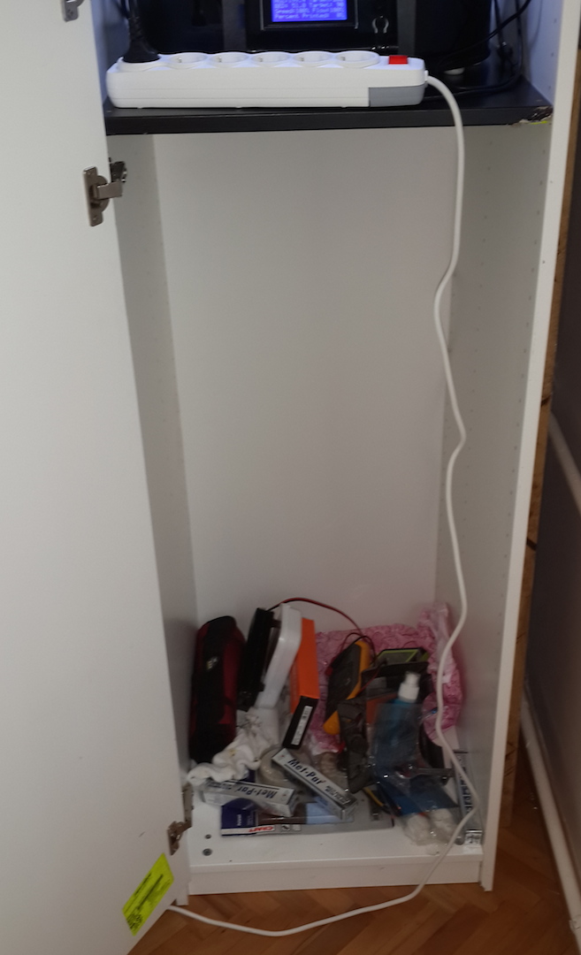 1- Cut holes in the side and the shelf to be able to have the power cables coming in nicely. Right now it is cluttering the machine area.