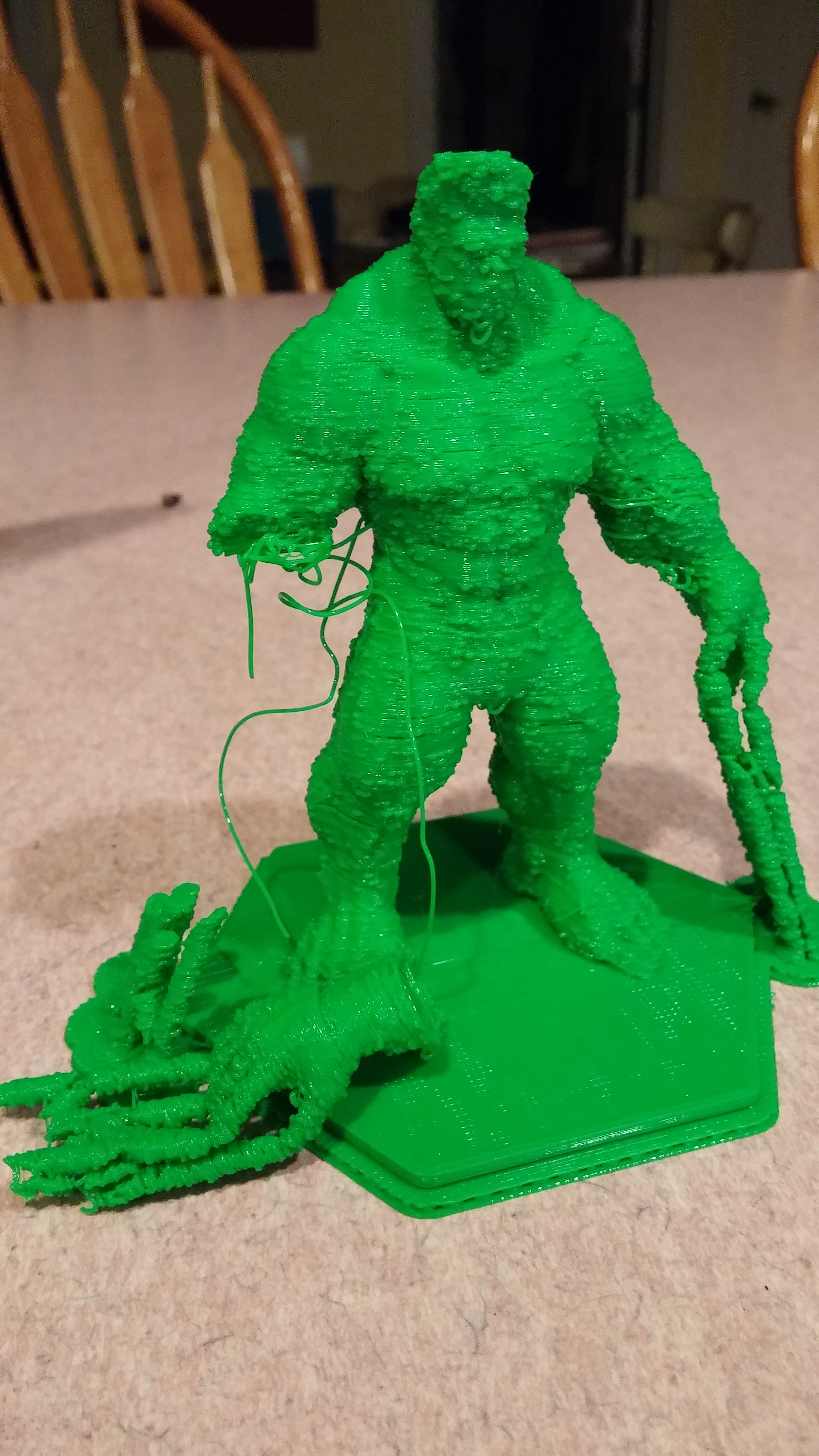As you can see, the right arm ended up printing in two sections and eventually broke off. I noticed that the arms were very unstable and saw the PLA fan shroud even bump into the left arm a couple of times during the print process.