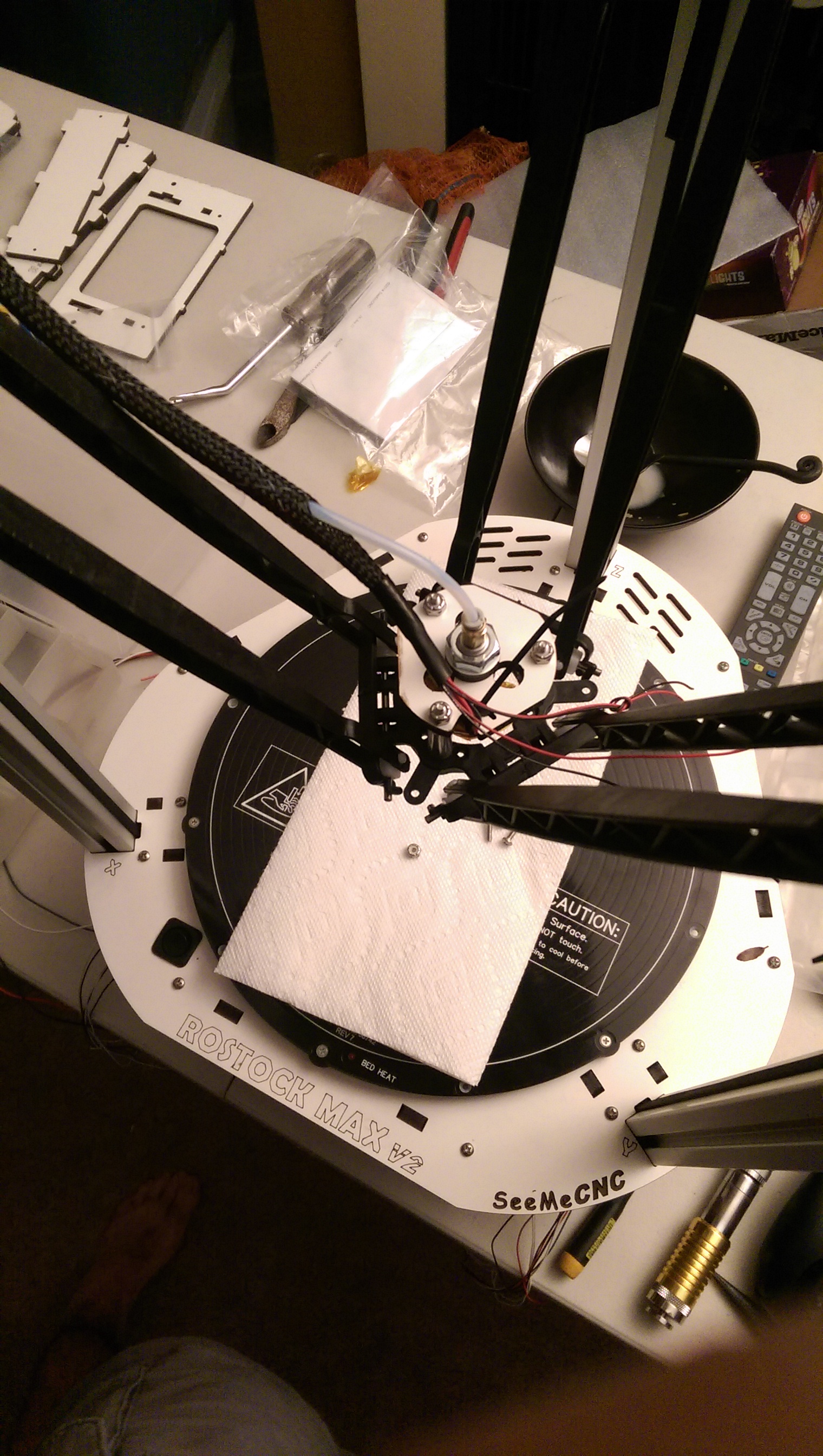 This is my first machines, and therefore my first build thread. I received my Rostock kit last weekend, and began the assembly promptly. I took pictures along the way, but did not stop to start this thread, I was too excited. So here are the pictures from it, since I have now completed the assembly and am having trouble with the printing (which I will show at the end).