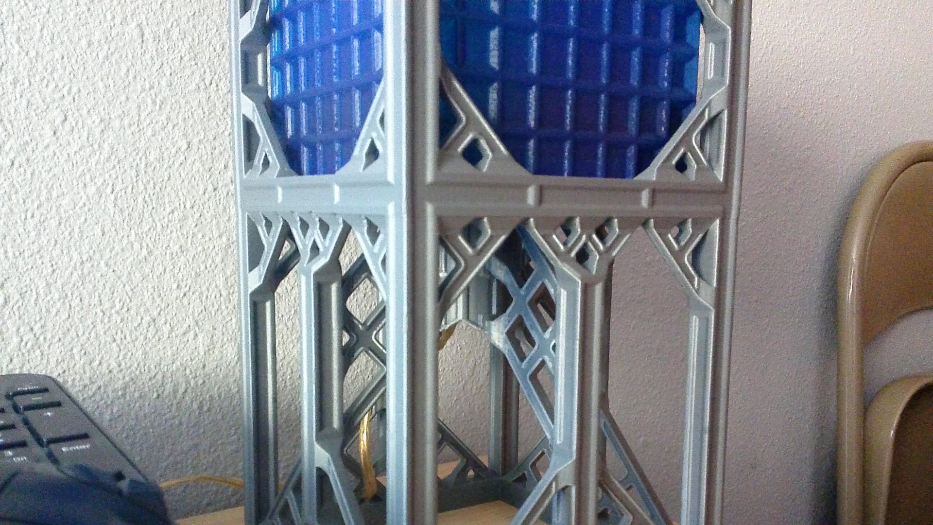 I recently made a lamp. It is made of two printed structures; a base and a translucent shade. The base is printed in silver colored PLA, measuring 6"x6"x12" - print time 29 hrs. The shade is printed is 'soulful blue' approx. 6"x6"x6", 0.05" thick wall - print time 10 hrs. Both parts are printed as one piece with no supports used. Parts were printed on a Rostock MAX V1.