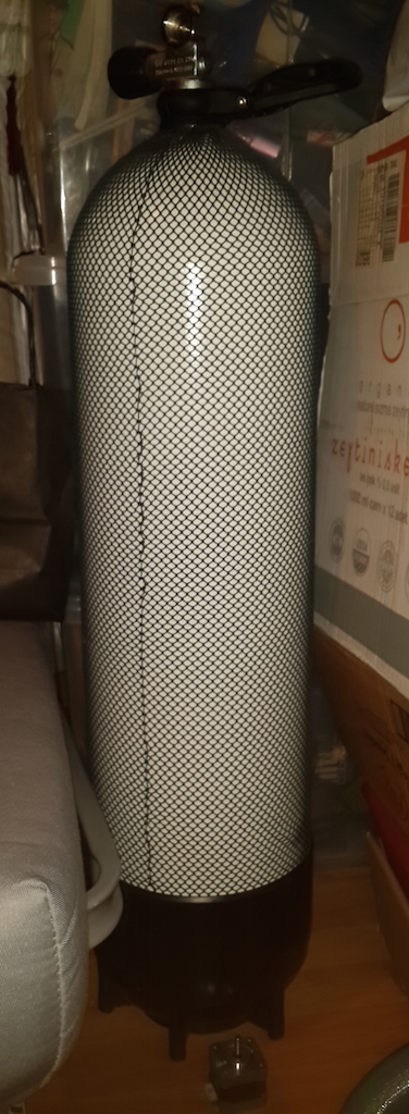 Here is a picture of the large tank, it has a water capacity of 20L, when pumped up to 200bars that makes 4000L of air. I put a stepper motor on the floor for size comparison.