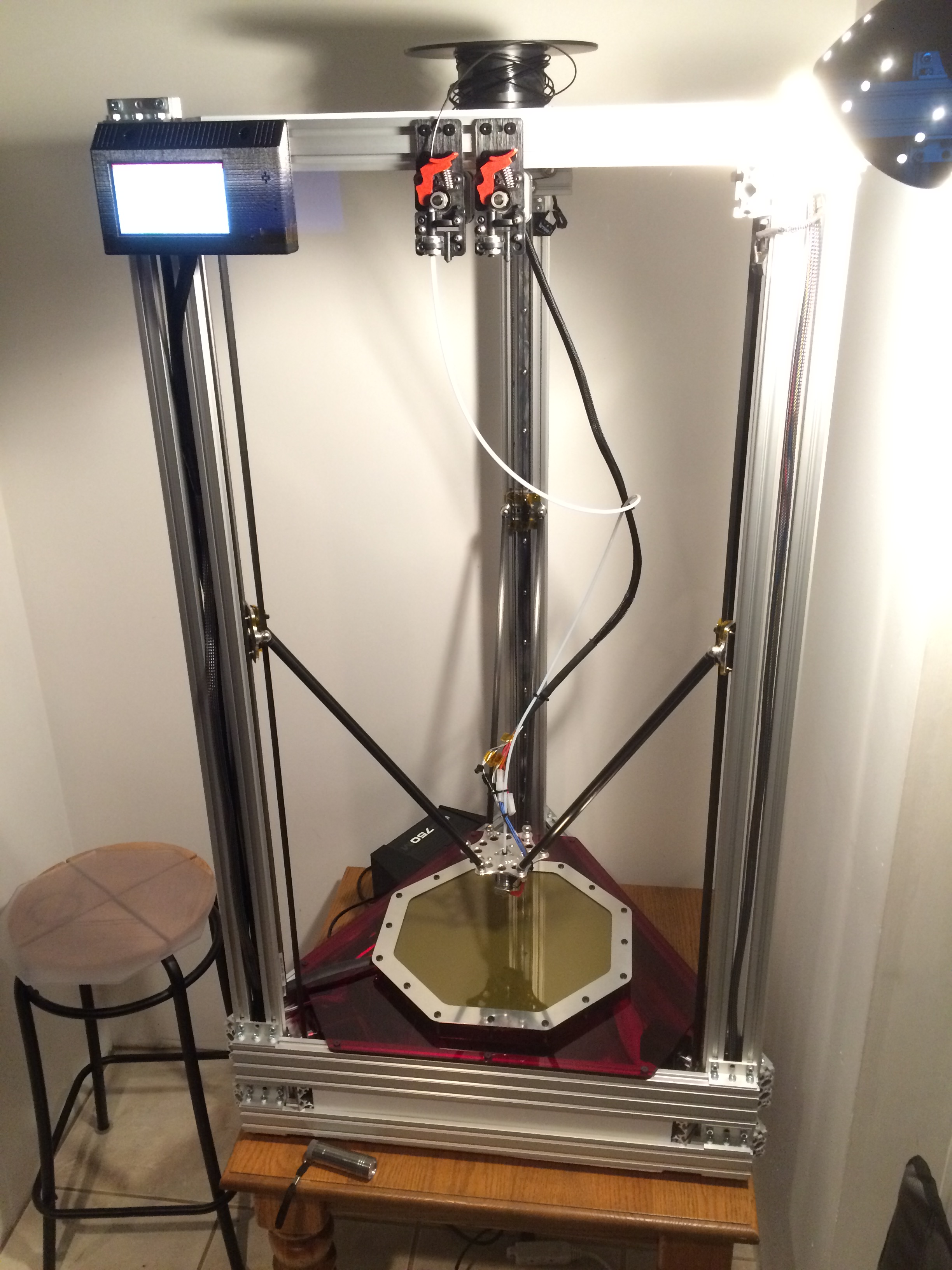 The jist of it is that it's an all aluminum frame, with an expanded horizontal footprint. The print volume is designed to be the exact specs of the rostock max -- 280 mm cylinder by 14" tall. The actual maximum dimensions are about 276 mm and just over 350 mm in print height depending on where you print. Near the towers it's slightly less than 350.