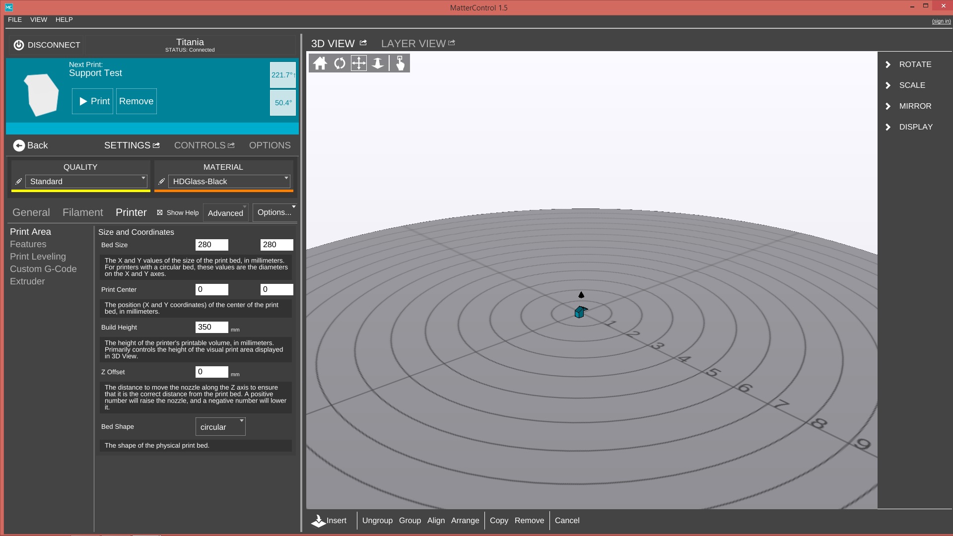I just installed MatterControl 1.5, loaded a small test object and immediately ran into some strange behaviour. The object was correctly placed at 0,0 on a circular bed but after slicing it was moved off the edge of the bed. As well, in 2D Layer View the sliced object was placed far from the center and on a rectangular bed.