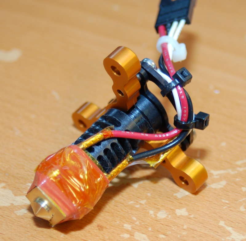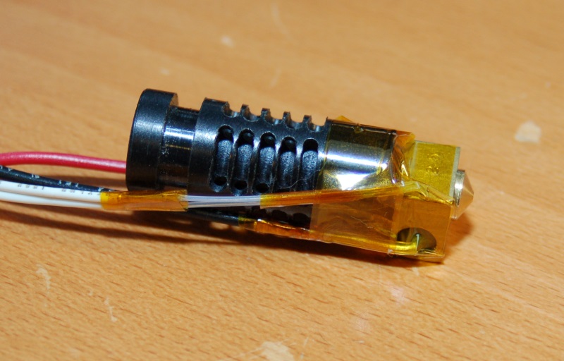 Here's what the J-Head's single heating resistor looks like crimped out: You cover those crimps with a little bit of Kapton and you're good to go!